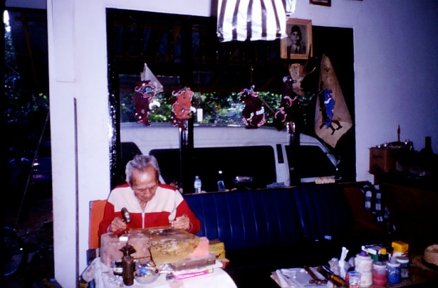 As we were watching Pak Rajeg work, Sumandhi told us that that evening was the temple ceremony when they would bring out the newly-restored Barong, Rangda, and Durga figures to check them out to make sure they hadn't become infested with beetles, and to give them their offerings. Would we like to come? |