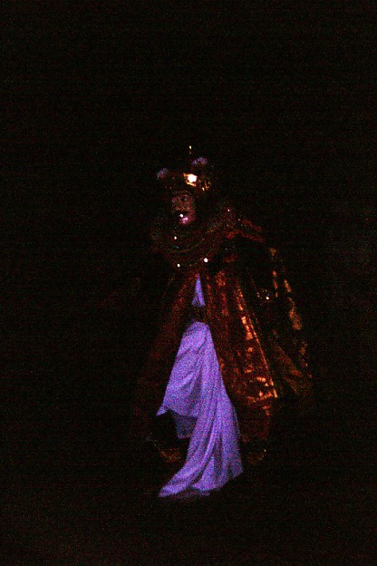 After a few moments - the Barongs were being told how to behave themselves in the inner sanctum - they were ushered into the inner temple, and the main part of the evening could begin. The priests continued their chanting as the Barongs were installed into their positions in the inner temple, while outside Pak Dibia appeared, now dressed in his spectacular Topeng costume, and the gamelan struck up. |