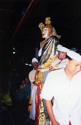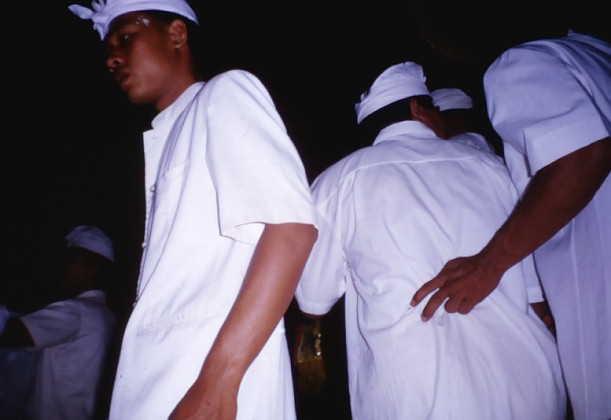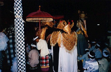 Many of the rituals we were watching seemed to revolve around rice, and ensuring a good harvest. It dawned on us that beneath the Hindu veneer, which by now was looking very thin, what we were witnessing was a rice cult ceremony - the ancient traditions of making offerings to the gods for fertile fields and a good harvest. The rice goddess Dewi Sri, was really much older than the Hindu-Buddhist tradition, and was the ancient goddess of the harvest on which the Balinese' lives depended. This was not a simple religious festival, this was a matter of survival, for without rice, the people would starve. The final dance was one that is never seen performed in secular performances. Wearing a special mask, and representing the Balinese "everyman", Dibia takes an offering basket and strides into the inner temple. After a few minutes, he re-emerges, scattering offerings in his wake. This seemed to be a signal to the crowd that the ceremonies were over, and they rushed forward into the courtyard to receive their holy water. By now we felt so much a part of the amazing evening's events that we sat with them and got splashed too.