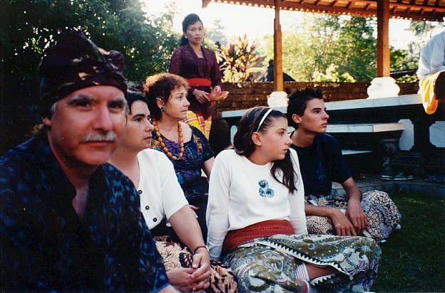 After the VIPs had received their offerings, prayers were said. I've never come across a more open and accepting religion than the Balinese form of Hindu-Buddhism. Although their rituals are mainly a form of Hindu, they see God in many forms - in the natural world around them, in their families and ancestors, in flowers, and incense. Anything to make the world more beautiful is an offering to their gods - it's been said that Bali is a place where every breath is a prayer. The Balinese delight in your own beliefs and will not try to convert you to theirs - on the contrary, your own beliefs are part of the beauty they see in everything, and they will encourage you to pray to whatever god you follow. |